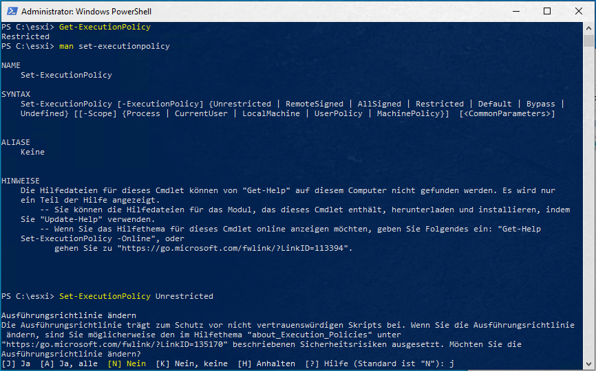 Wir haben nun die PowerCLI installiert und sind nun in der Lage, wenn die ExecutionPolicy auf Unrestricted gesetzt ist, unser .\ESXi-Customizer-PS-v2.6.0.ps1 auszuführen. Sollte unsere Ausgabe zur ExecutionPolicy, wie in dem Bild ausschauen, müssen wir diese mit folgendem Befehl konfigurieren.