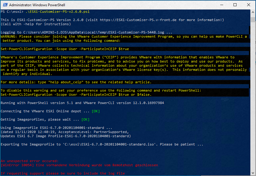 Führen wir nun unser heruntergeladenes Skript aus, würden wir im Normalfall ein “rohes” Image erhalten. Anscheinend gibt es hier aber Probleme mit dem Download für das Image des ESXi Version 6.7. Es taucht am Ende des Skriptes folgende Fehlermeldung auf.