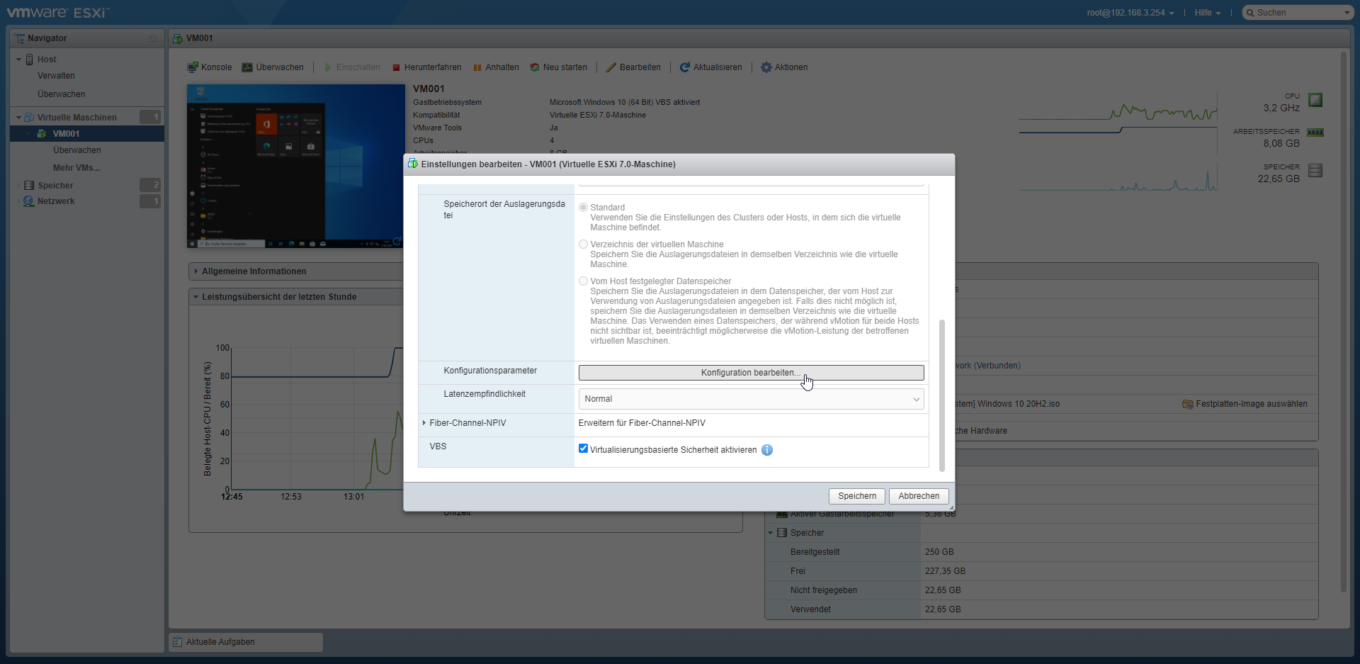Wir melden uns also auf dem Virtualisierungshost an und wählen die betreffende virtuelle Maschine, wie oben dargestellt, aus. Als nächstes gehen wählen wir das Aktionsmenü aus und klicken auf den Menüpunkt Einstellungen bearbeiten.
