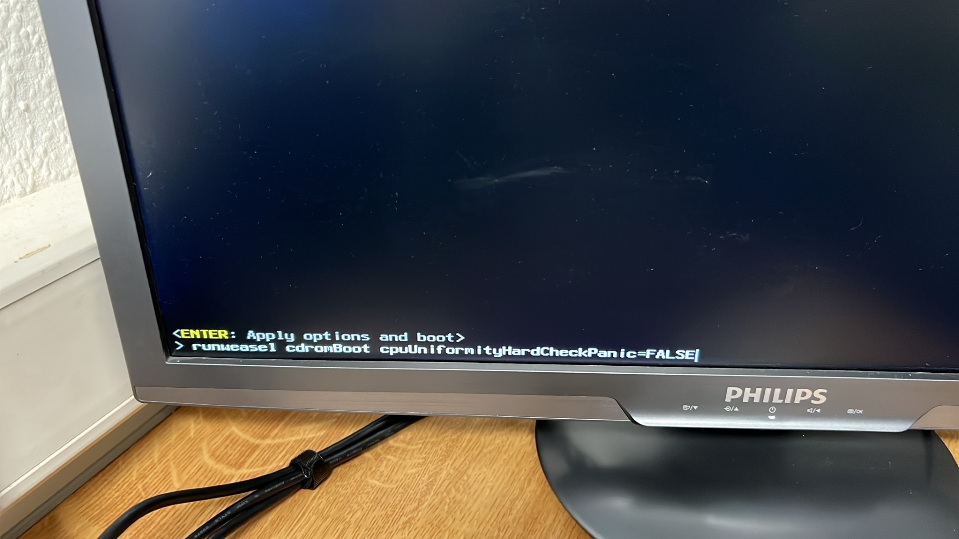Während des Bürovorganges muss man zur gegebener Zeit die Tasten Shift+O drücken. Und die Option cpuUniformityHardCheckPanic=FALSE hinzufügen. Achtet bitte darauf, dass ihr keine anderen Zeichen zu den Bootoptionen hinzufügt, überschreibt bzw. entfernt. Im schlimmsten Fall kann es andernfalls zu Problemen führen, wenn das System so hochgefahren und beispielsweise ein Update gefahren wird. Das Resultat bei diesem Vorgang, wäre ein gescheitertes Update, eine überschriebene Passwortdatei und ihr könnt euch nicht mehr einloggen. Möchtet ihr das System dauerhaft mit dieser Bootoption ausstatten, dann solltet ihr über die Konsole folgenden Befehl eintragen.